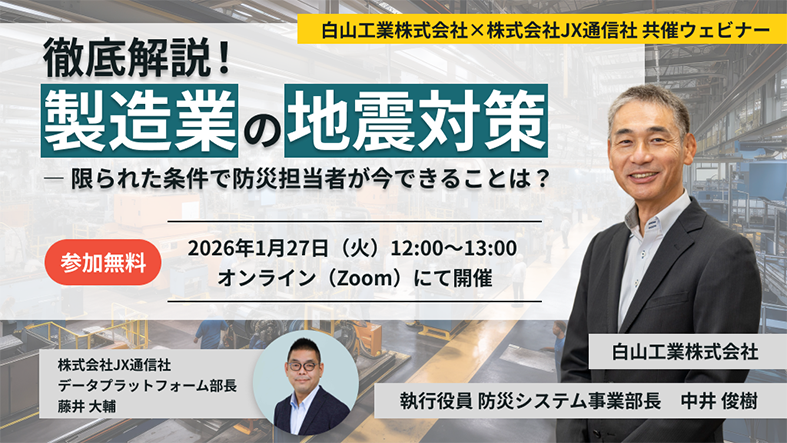 - ※企業のBCP・安全/リスク管理 関連部門にご所属の方を対象としております。個人の方、株式会社JX通信社ならびに白山工業株式会社の同業者のご参加については、お断りさせていただく場合があります。