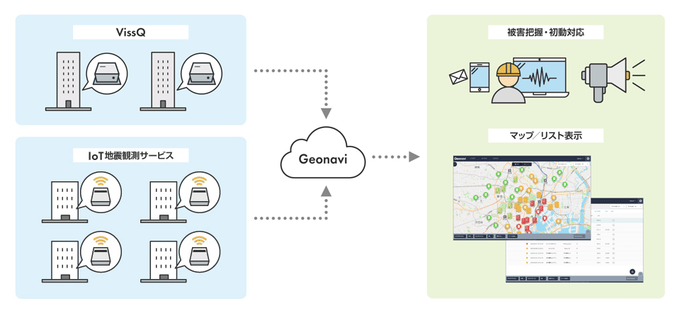 各ビルに地震計を設置することで建物の揺れを視える化し、地震発生時の人と建物の安心・安全をサポートするシステム「VissQ」と「IoT地震観測サービス」を提供。VissQの被災度判定結果をIoT地震観測サービスのクラウドプラットフォームGeonaviに表示できる「VissQ-Geonavi連携サービス」を用いることで、クラウド上で管理物件の被害状況の一元監視を可能としています。
